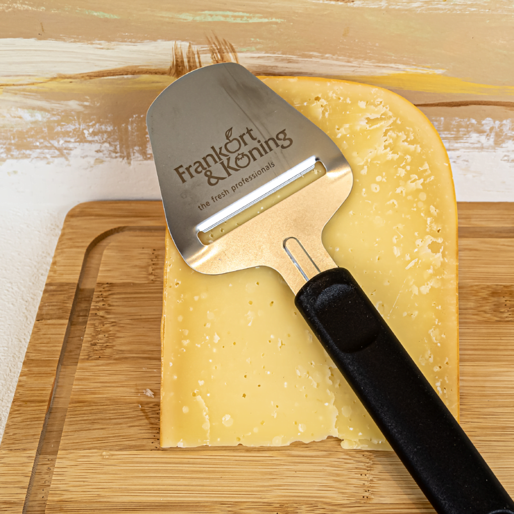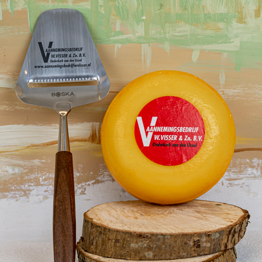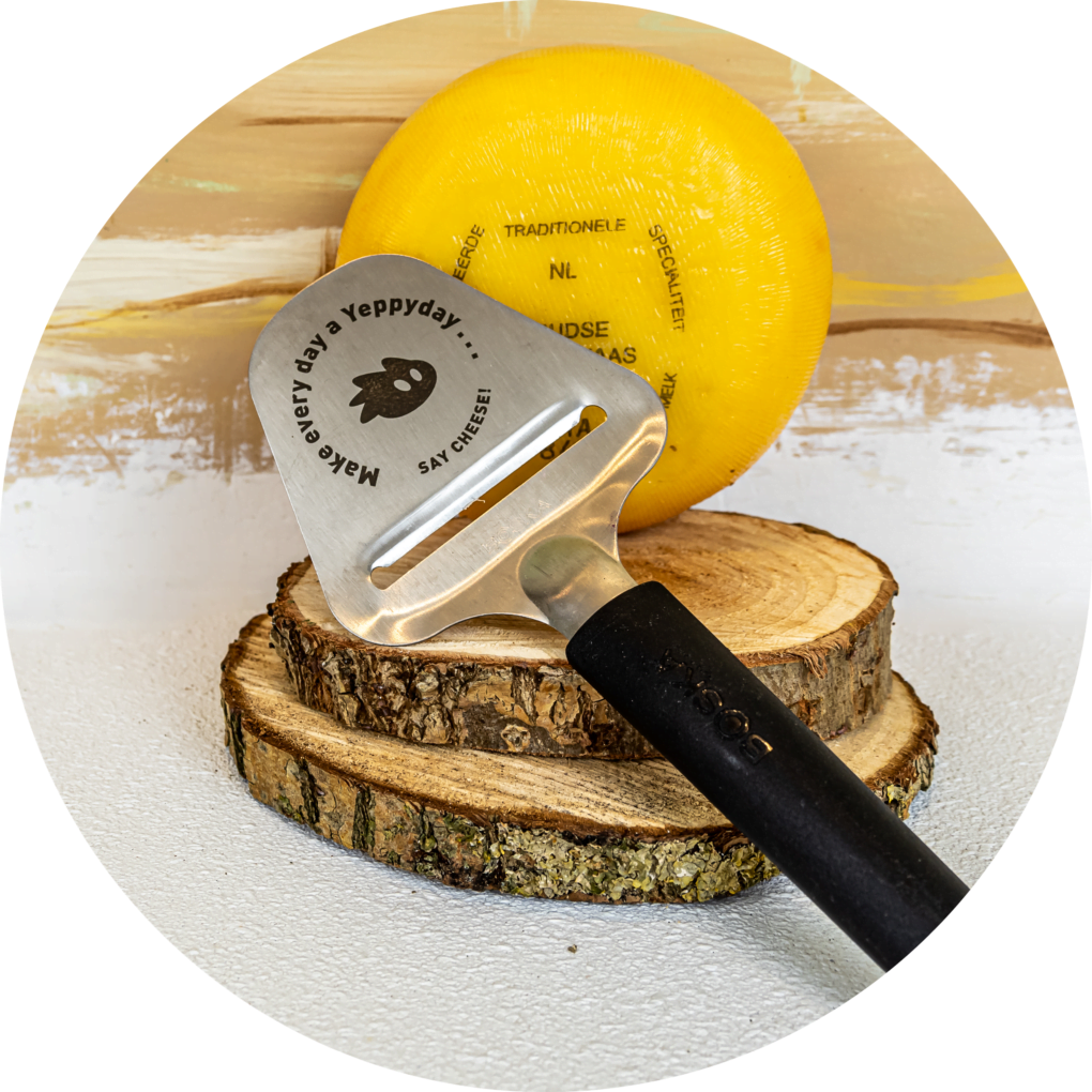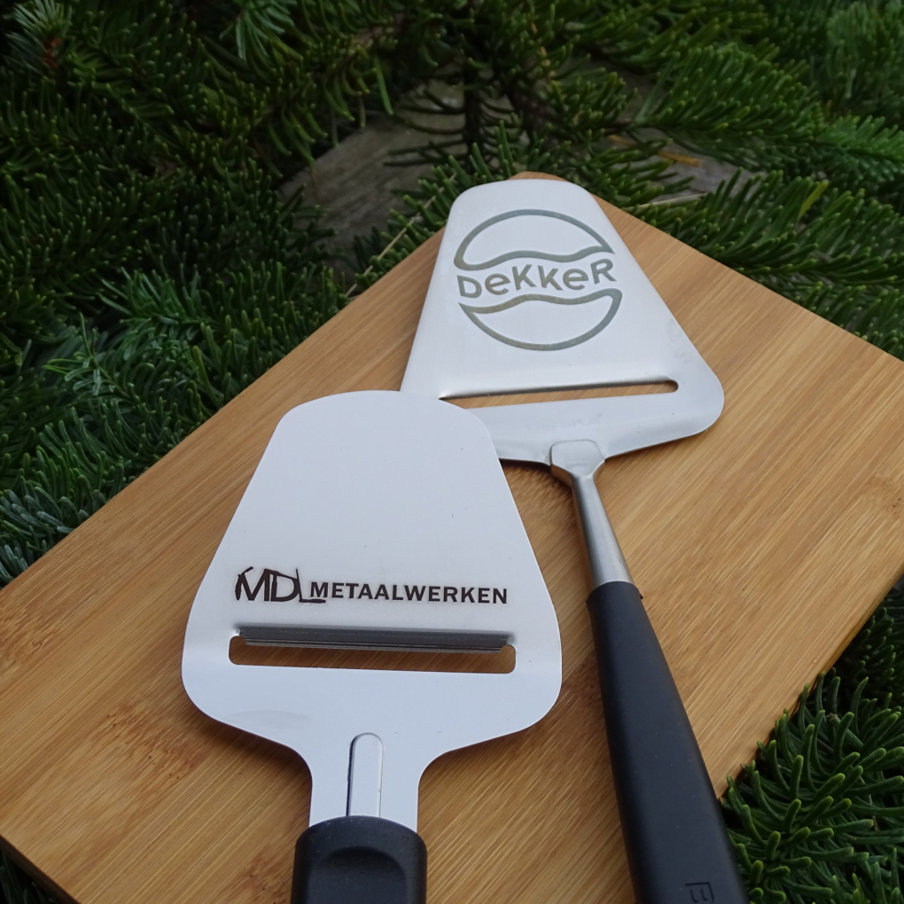 Een logo op een kaasschaaf maakt je geschenk compleet.
